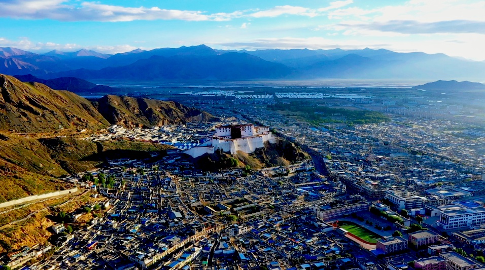 早晨的阳光的第一个阳光照在Shigatse City Sangzhuzi区Chengdong Street的Jiangluo Kanga社区。五星级的红旗在空中张开。