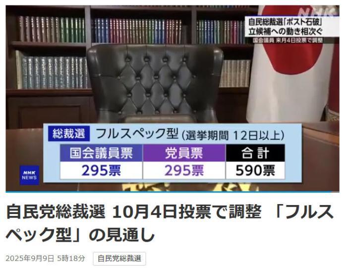 中国新闻局,9月9日。根据日本广播协会(NHK)的一份报告,日本新的自由民主党的当选预计将于10月4日举行,投票结果将于同一天发布。图像来源:日本广播协会(NHK)报道说屏幕截图报告说,以SO称为“完整版”形式举行的自由民主党在日本党的党员和朋友都可以投票。目前,前自由民主党秘书Toshimitsu Motegi和现任日本内阁负责人Lin Fangmasato正式表示愿意参加选举。日本的艾萨希·辛本(Asahi Shimbun)早些时候报道说,农业,森林和渔业农业部长,金吉罗·库苏米(Jinjiro Koizumi)和前经济安全部长塔卡西·塞米(Takaichi Saemi)也很受欢迎。由于自由民主党仍然是日本的执政党,因此自由民主党的新总统Y将取代Shigeru Ishiba,并成为日本的下一任总理。